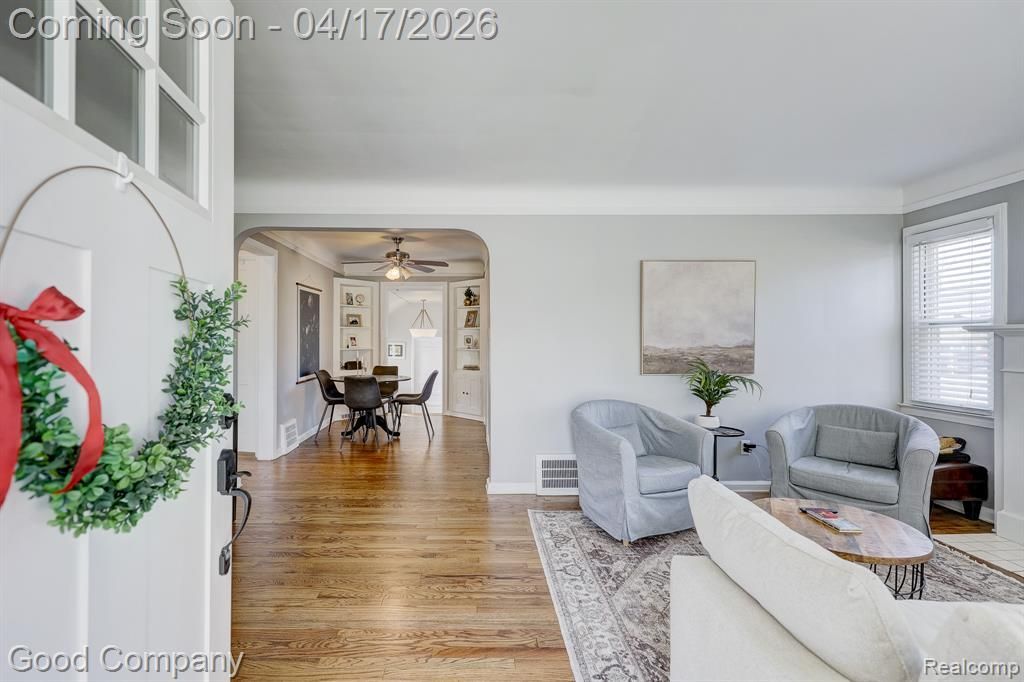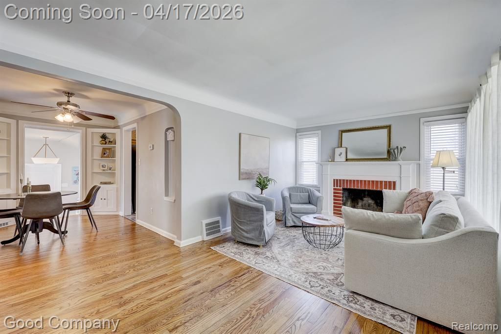 ***All offers are due Monday, April 20, 2026 at 12:00PM.*** Open house! Saturday, April 18th from 12pm-2pm. Move-in ready bungalow in Royal Oak with loads of vintage character, a beautifully renovated bathroom, and a spacious fenced backyard just minutes from downtown. Set on a corner lot, the covered front porch with stone accents sets a warm and welcoming tone. Inside, the bright living room features hardwood floors, coved ceilings, and a cozy brick fireplace that anchors the space. An arched passageway flows into the dining room, which is highlighted by built-in shelving on both sides and continues the hardwood floors throughout. The kitchen offers stainless steel appliances and ample cabinet space. Two nice-sized bedrooms share a stunning newly renovated full bath with patterned tile floors and a glass-enclosed tiled shower. Step down from the dining room into a bright, functional flex space with vaulted ceilings, abundant windows, and a door leading out to the backyard deck, with direct access to the attached garage. The partially finished basement offers great bonus space with carpet and track lighting, a separate laundry area, and plenty of storage. Out back, the fenced yard features a large wood deck with a pergola, perfect for entertaining, and patio furniture is included with the sale. Close to downtown Royal Oak shops, restaurants, and all the best the area has to offer. Welcome Home!