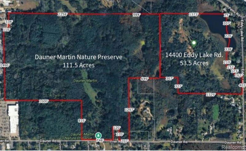 53.5 Acres with 1,050 Ft of Frontage on Nichols Lake – Fenton, MI Rare opportunity to own 53.5 acres with approximately 1,050 feet of frontage on Nichols Lake. This expansive parcel is adjacent to Dauner Park Nature Preserve giving access to an additional 111.5 acres of land. This unique property offers a mix of wooded and open areas, along with direct water frontage providing a natural setting with abundant wildlife throughout the property. The land features varied terrain suitable for a variety of potential uses, including residential development, recreational use, or investment. An existing dirt bike track is located on the property, offering immediate recreational appeal. Multiple potential building sites may be available, many with scenic views of the lake and surrounding landscape. Property provides a private setting while still being conveniently located near local amenities, major roadways, and within a short drive to downtown Fenton. Buyer to verify all information, including zoning, land use, and building requirements.