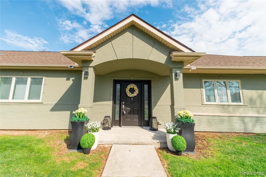 Exceptional sprawling broad front ranch situated on a corner lot of over 1/2 acre just a short distance from the Detroit River. This 2,624 sq ft open-concept home was completely renovated and redesigned in 2015 and features 3 bedrooms and 2 full baths. Move-in ready—get your keys at closing. Vaulted ceilings and skylights flood the home with natural light, while architectural details such as stacked stone accent walls and backlit birch tree features create a warm, modern ambiance. Radiant heated stained and sealed concrete floors run throughout, complemented by a forced-air furnace and central air for year-round comfort. Oversized gourmet kitchen features a 36" professional gas range, hammered copper farmhouse sink, extensive granite countertops, tile backsplash, KraftMaid cabinetry, under-counter beverage refrigerator, and generous space for a large dining table with built-in dry bar. Spacious great room showcases a built-in fireplace with stacked stone surround. Newer sunroom with Andersen windows and doors expands the living space and opens to an adjacent patio for seamless indoor-outdoor living. Primary ensuite offers a spa-like experience with a double shower featuring a dual shower system or enjoy as a walk-in rainfall shower, along with bidet and dual sinks. Oversized 4-car garage includes massive attic storage, two EV receptacles, and interlock generator hookup. Ring security cameras included. Roof on home and shed approximately 12 years old. True ranch living with no steps. Built with 12" block construction and R-38 insulation in both walls and attic for added efficiency and durability.
