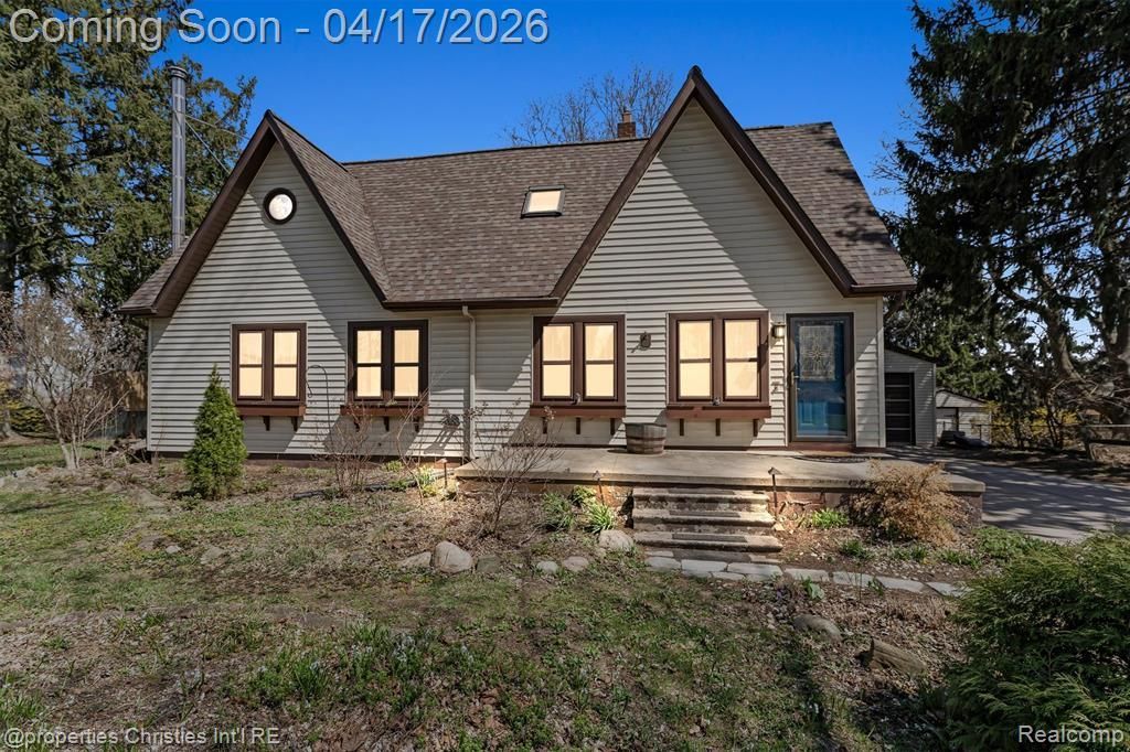 Full of character, original charm and updates with an inviting feel from the moment you step inside. The living room features newer LVP floors, detailed wood trim, and built-ins, with arched openings that connect to both the dining room and staircase. The kitchen is functional and charming with painted cabinets, butcher block counters and custom spice shelf, while the updated half bath adds personality with beadboard, built-ins, and granite-topped cabinetry. A spacious family room addition with cork flooring, built-ins, and a wood-burning stove opens to the deck and expansive half-acre yard, with a secondary staircase leading upstairs. Upstairs, additional bedrooms and the primary suite which includes a private balcony overlooking the yard, along with a remodeled full bath. The finished basement provides additional living or hangout space plus ample storage. Major mechanical updates include a new roof (2025) and furnace (2023). The fenced yard features established perennials, a chicken coop, two sheds, and an oversized garage with a newer metal roof.