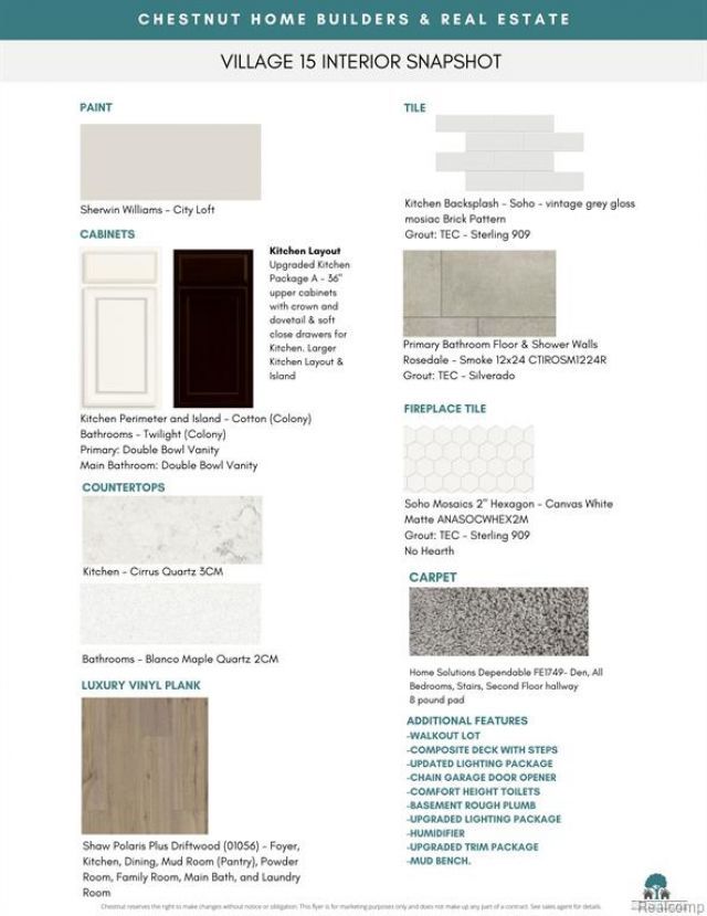Under construction by Chestnut Home Builders in desirable Chestnut Village! Fences are Allowed! A full yard of sod, sprinkler system & three trees are included! This 3-bedroom, 2.5-bath “Linden” floor plan with a walkout basement, features a modern open-concept layout with a spacious great room, fireplace, and upgraded kitchen with quartz countertops, island, soft-close cabinetry, and designer backsplash. Luxury vinyl plank flooring runs throughout the main living areas, complemented by a functional mudroom with built-in bench. Upstairs, the primary suite offers a double vanity, tile floors & shower, along with two additional bedrooms, a loft and a full bathroom. The walkout basement includes rough plumbing and provides excellent potential for future finishing. Enjoy outdoor living on the composite deck with stairs overlooking the wooded backyard view. The home’s curb appeal is enhanced by an upgraded elevation with pacific blue siding, board & batten accents, and stone detailing. Additional features include an enhanced lighting package, upgraded trim throughout and stainless steel appliances. Built using 9' tall Superior Wall foundation system which is pre-insulated creating a more comfortable lower level, stronger than traditional poured foundations, studs already in place, ready to finish and so much more. Quality craftsmanship and thoughtful design. Community amenities include walking trails, park area with pavilion, fenced in dog park & more! Located at the corner of Whitmore Lake & North Territorial. Extremely Easy US-23 Access & just 7 Miles to the University of Michigan, 8 Miles to University of Michigan Hospital & 10 Miles to Brighton. Targeting an August completion.