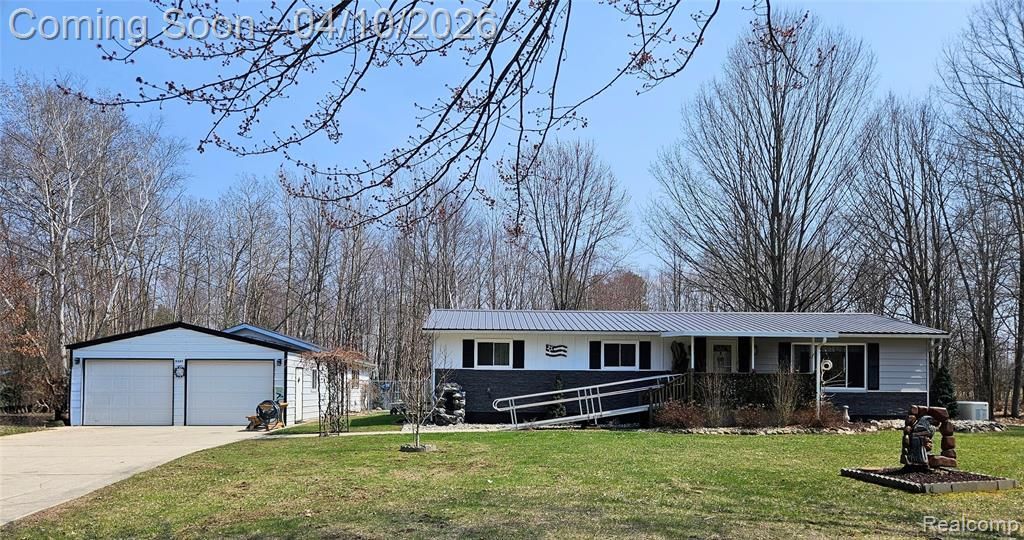 Well-maintained ranch home situated on a spacious, park-like setting with mature trees and a beautifully open yard. This property offers great functionality inside and out, featuring a detached 2-car garage, fenced backyard area, additional storage sheds, and a whole-house Generac Guardian 14kW backup generator. Exterior features include a covered front entry, rear deck/patio area, and plenty of room to enjoy the outdoors. A great opportunity for buyers looking for a peaceful setting with practical extras already in place. Updated home with great extras, including vinyl windows, bay window, beautiful sunroom, oak cabinets, pantry, vinyl plank flooring, and main floor laundry. Recent updates include mini-split in 2020, Rheem furnace in 2023, metal roof in 2024, hot water heater in 2025, and fresh paint in 2025. Fenced backyard, standby generator, front awning, outbuildings, newer well, and septic recently serviced. Washer and dryer stay. Records and blueprints have been kept.
