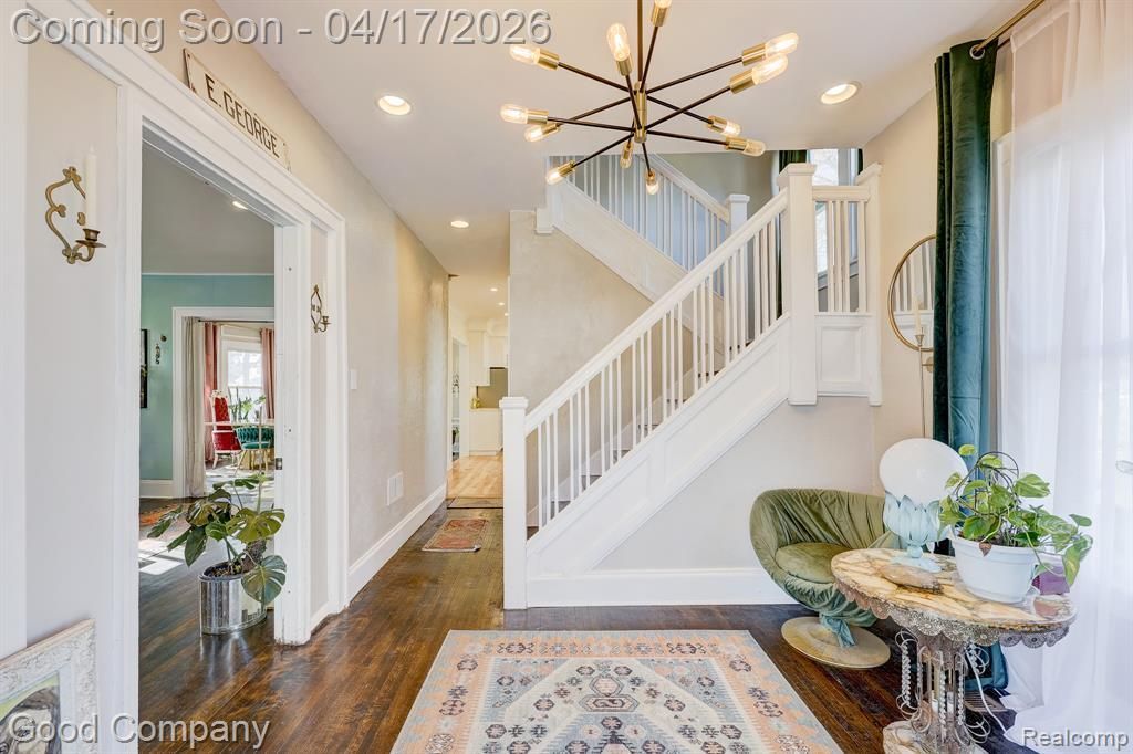 Impressive colonial in Hazel Park with five bedrooms, generous living spaces, a beautifully renovated kitchen, and an expansive private backyard on an oversized lot. A welcoming covered front porch leads into a dramatic entry foyer with a statement chandelier and classic exposed staircase. The spacious living room features hardwood floors and a stone accent wall, flowing naturally into a beautifully appointed dining room with picture frame wall molding and an elegant chandelier. Beyond the dining room, a bright flex room makes a perfect reading nook or home office. The renovated kitchen is a true showstopper with white shaker cabinetry, gold hardware, subway tile backsplash, stainless steel appliances, and peninsula seating, all set on warm hardwood floors with pendant lighting overhead. A convenient first floor bedroom, stylish full bath with subway tile tub surround, and a dedicated laundry room with patterned tile floors and back deck access round out the main level. Head upstairs to find four additional bedrooms, a spacious library and study, a large second full bath, and a versatile unfinished third floor attic with tons of potential. The full basement offers plenty of storage space. Outside, the oversized backyard is a true retreat with a wood deck, brick fire pit, paver patio, and lush mature landscaping, plus a detached two-car garage. Ideally located close to Royal Oak, Ferndale, and downtown Detroit. Welcome Home!