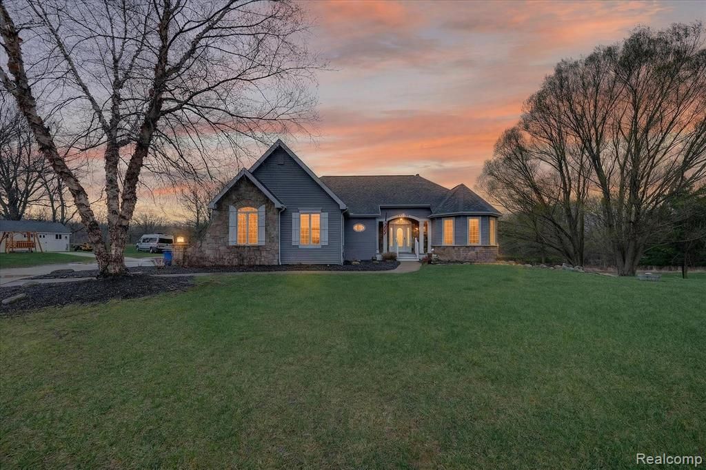 Welcome Home to this custom-built, well-maintained ranch on 2.3 Private Acres. Discover the perfect blend of subdivision convenience and total privacy in this 3-bedroom, 3.5-bathroom ranch. Nestled on a sprawling 2.3-acre lot surrounded by nature, this home offers a serene retreat with high-end finishes and thoughtful design throughout. The Heart of the Home is the impressive living room, where soaring vaulted ceilings and a cozy fireplace create an inviting atmosphere. The space bathes in natural light thanks to oversized windows that offer picturesque views of the wooded backyard. The chef-inspired kitchen is a standout, featuring Hardwood flooring, abundant cabinetry and storage, and a large center island for meal prep and casual dining. Seamless flow to the laundry room for ultimate convenience. Main Level offers first-floor laundry with storage. A master suite, featuring elegant bay windows, a spacious walk-in closet, and a spa-like ensuite bath equipped with a jetted tub and an oversized shower. Working from home is a breeze in the dedicated private library, which offers a quiet space for focus. The fully finished walkout basement doubles your living space, providing the perfect setup for a home theater, gym, or recreation area. After a long day, unwind in your private indoor sauna. Did I mention the house has a whole-house generator and lawn sprinklers! Added are two bonus rooms, the 3rd bedroom could be an office or bedroom, and the basement offers an additional bonus room that could be used as a bedroom or in-law quarters. This is a must-see!